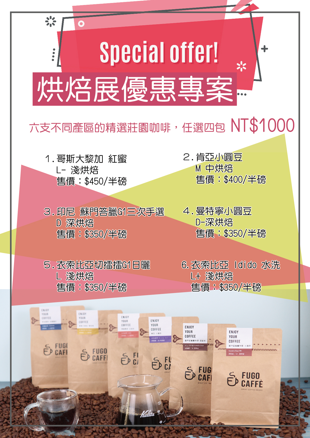 非常期待與大家見面的我們,為了參予一年一度的烘焙展,我們特別釋出優惠專案,致力推廣好喝的精選莊園咖啡,與我們Fugo獨家配方的特級綜合咖啡。